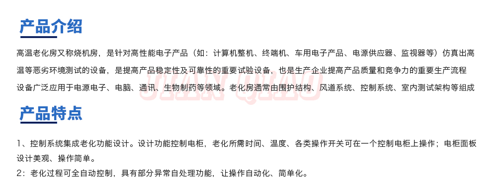 產品型號:JQHTA-12(非標定制) 品牌:劍 喬 用途:高溫老化房又稱燒機房,是針對高性能電子產品(如:計算機整機、終端機、車用電子產品、電源供應器、監視器等)仿真出高溫等惡劣環境測試的設備,是提高產品穩定性及可靠性的咨詢熱線:13829135130