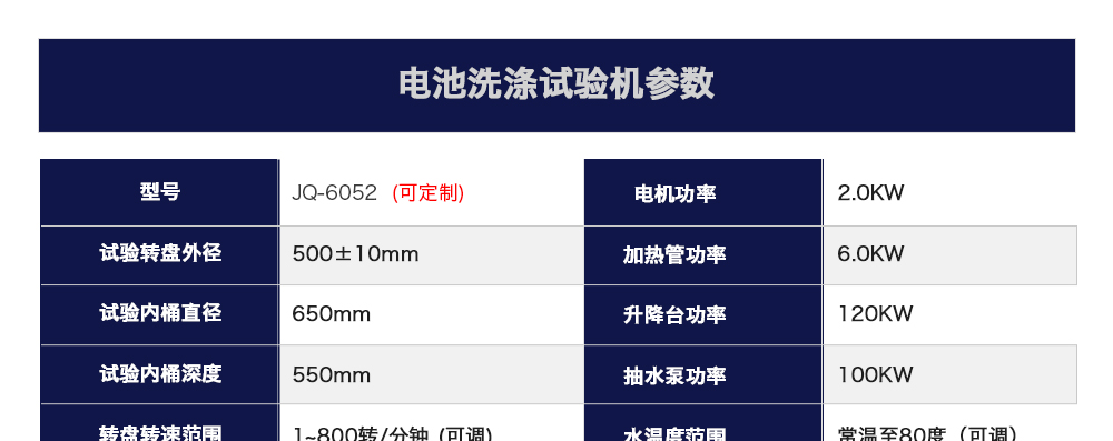 產品型號:JQ-6052 品牌:劍 喬 用途:電池洗滌試驗機,本實用新型涉及電池試驗設備技術領域,特指一種電池洗滌試驗機,架體設有測試箱體,測試箱體的下部設有洗滌箱,測試箱體內設有轉動槳,測試箱體內側面設有烘咨詢熱線:13829135130