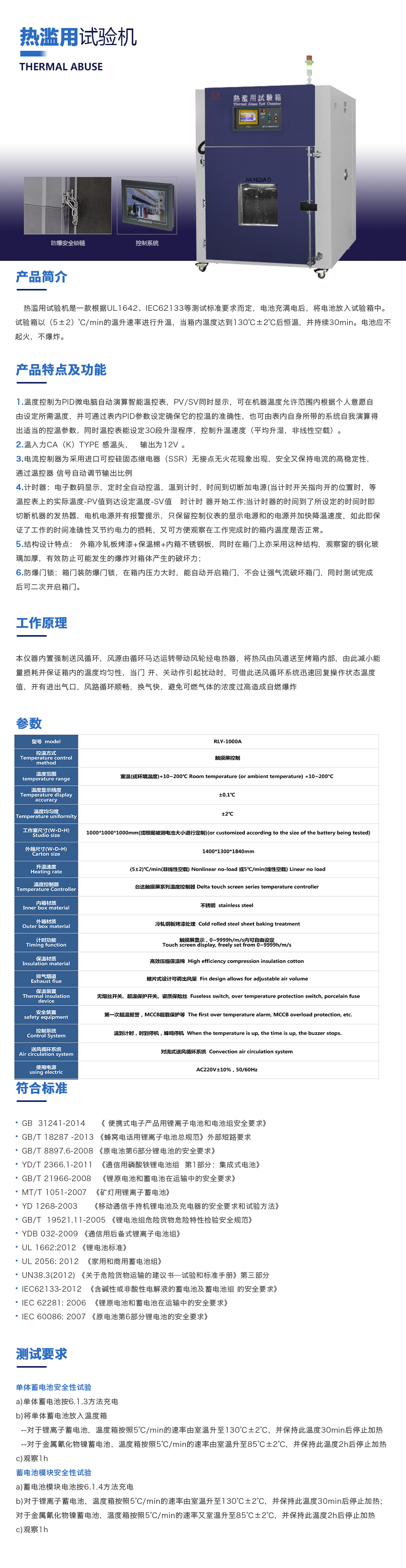 產品型號:JQ-8103 品牌:劍 喬 用途:熱濫用試驗箱是一款根據UL1642、IEC62133等測試標準要求而定,電池充滿電后,將電池放入試驗箱中。試驗箱以(5±2)℃/min的溫升速率進行升溫,當箱內溫度達到130℃±2℃后恒溫,并持續咨詢熱線:13829135130