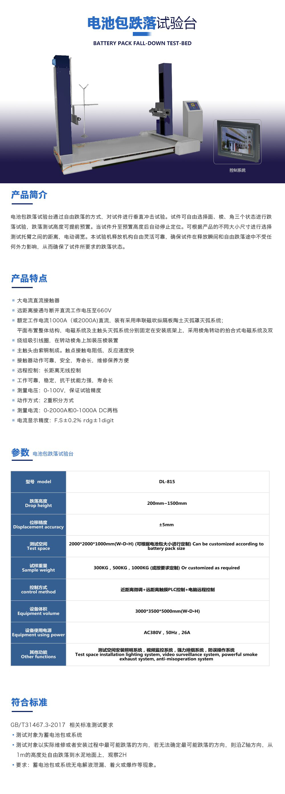 產品型號:JQ-F-815 品牌:劍 喬 用途:電池包跌落試驗臺通過自由跌落的方式,對試件進行垂直沖擊試驗。試件可自由選擇面、棱、角三個狀態進行跌落試驗,跌落測試高度可提前預置。當試件升至預置高度后自動停止定位咨詢熱線:13829135130
