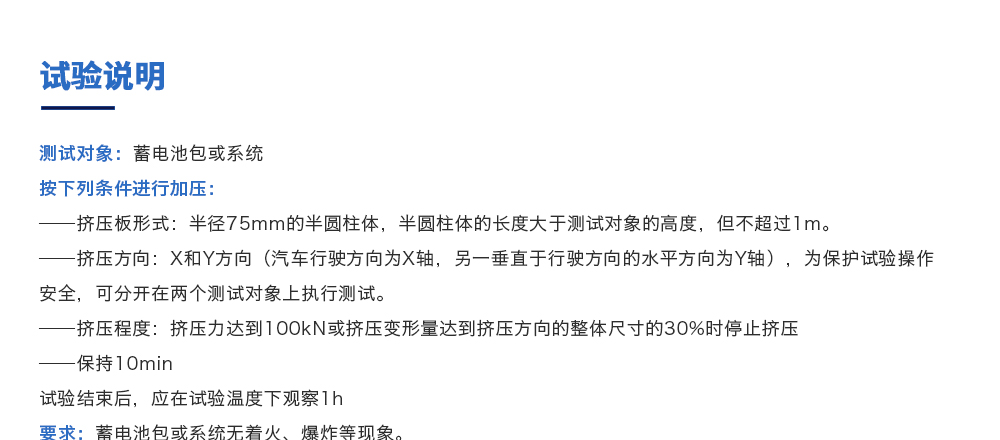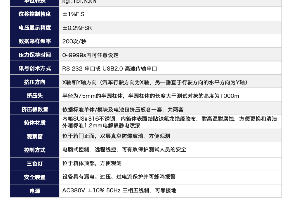 產品型號:JQ-5067-AL20 品牌:劍 喬 用途:電池包擠壓試驗機模擬各類動力動力電池包和系統在運輸、儲存及使用過程中電池包遭受碰撞擠壓的情形,人工呈現電池在遭受擠壓時可能出現的不同狀況。咨詢熱線:13829135130