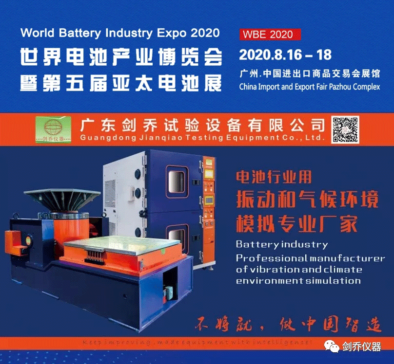 2020年8月16-18日,廣東劍喬試驗(yàn)設(shè)備有限公司【劍喬儀器】將攜旗下最新試驗(yàn)設(shè)備亮相2020世界電池產(chǎn)業(yè)博覽會(huì)暨第五屆亞太電池展,現(xiàn)場(chǎng)展示:振動(dòng)試驗(yàn)系統(tǒng)、溫濕度振動(dòng)三綜合箱、高加速?zèng)_擊試驗(yàn)臺(tái)、恒溫恒濕試驗(yàn)箱、冷熱沖擊試驗(yàn)箱等試驗(yàn)設(shè)備及鋰電池相關(guān)試驗(yàn)解決方案。