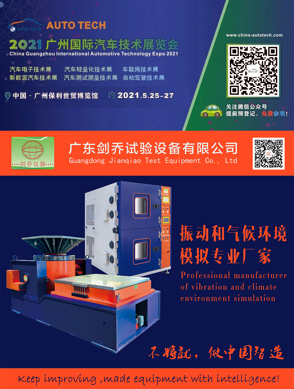 2021年5月25-27日,廣東劍喬試驗設(shè)備有限公司【劍喬儀器】將攜旗下最新試驗設(shè)備亮相AUTO TECH 2021 中國·廣州第八屆國際汽車技術(shù)展覽會,現(xiàn)場展示:振動試驗系統(tǒng)、溫濕度振動三綜合箱、高低溫防爆試驗箱、高加速沖擊試驗臺、電池?zé)釣E用試驗機(jī)、電池短路試驗箱、等試驗設(shè)備及動力電池相關(guān)試驗解決方案。
